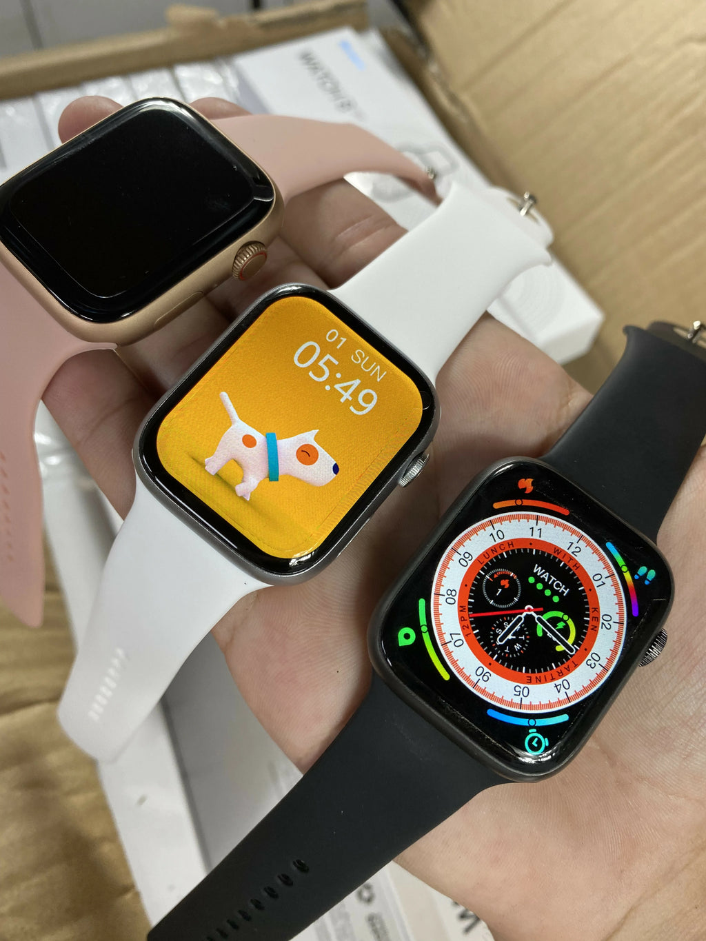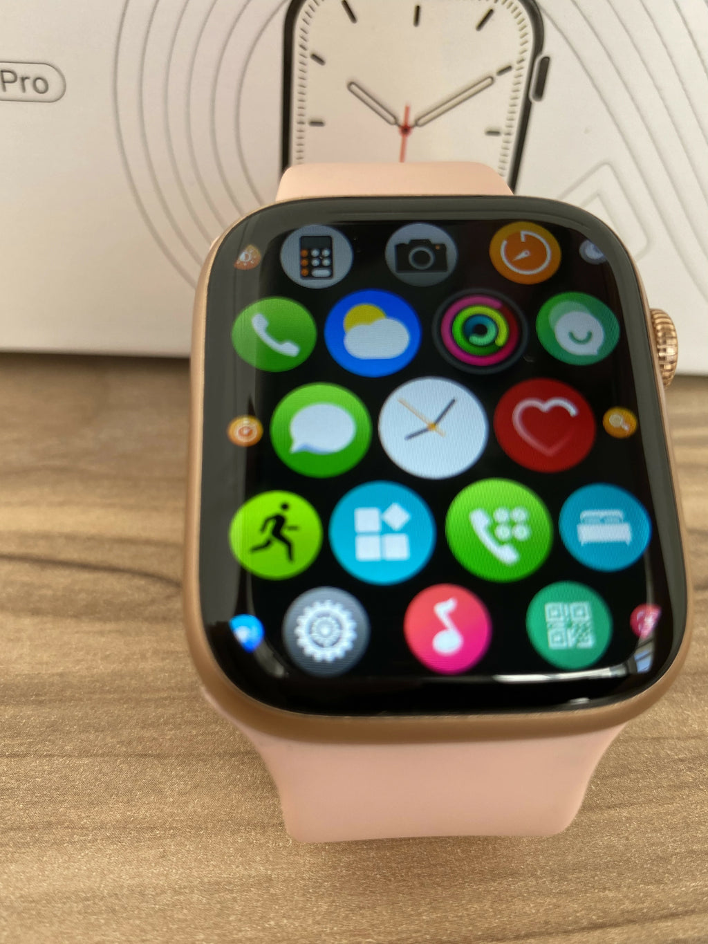 Esse relógio tem design retangular, lembrando um Apple Watch, com tamanho de aproximadamente 45 × 38 mm e cerca de 50 g. A caixa é de liga de zinco, com acabamento leve e esportivo. Tem botão redondo funcional na lateral, que ajuda a navegar no menu e dar zoom.