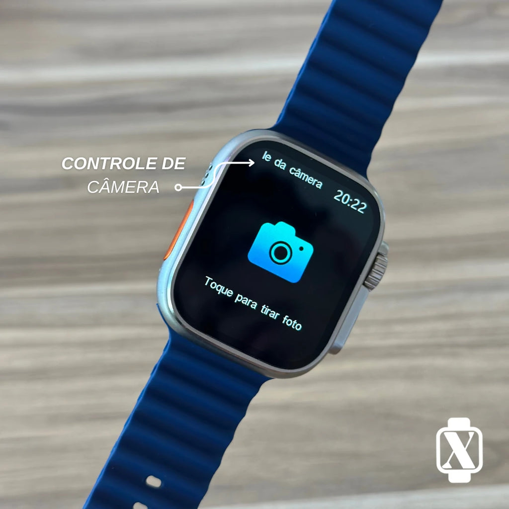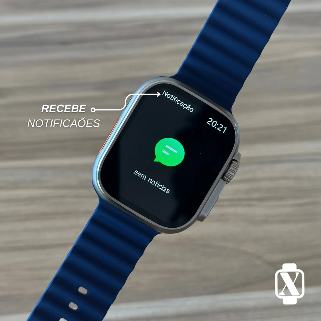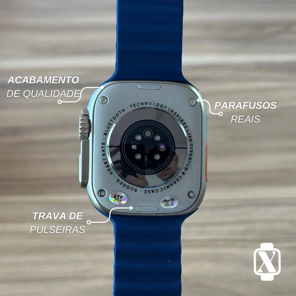 Ele tem formato quadrado, inspirado no Apple Watch Ultra, com caixa de metal (liga de zinco). Mede cerca de 49 × 44 × 14 mm e pesa uns 60 g, ou seja, é grande, mas parece confortável no pulso.