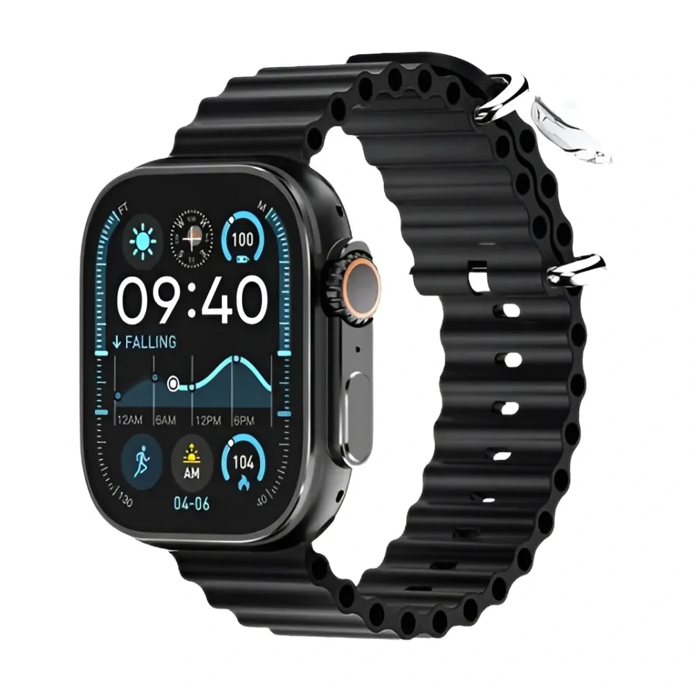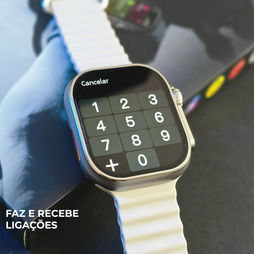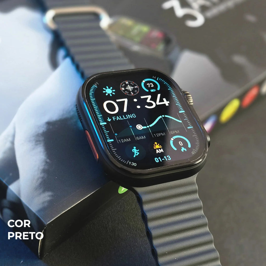 Tem uma cara robusta com caixa de 49 mm em metal ou titânio, com visual marcante e moderno. A pulseira é de silicone confortável, boa para treinos ou o dia a dia.