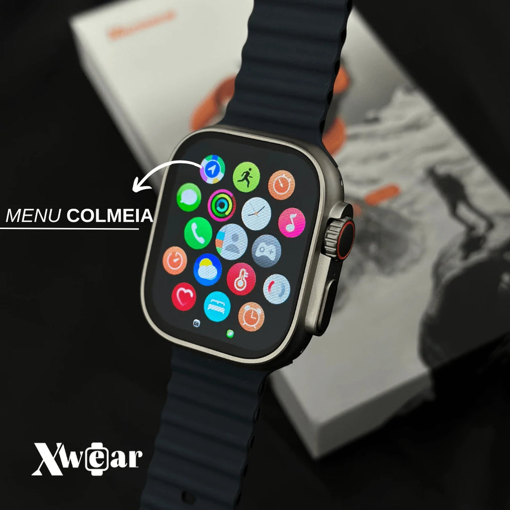 Caixa de 49 mm, acabamento metálico e estilo esportivo, com pulseira de silicone confortável.