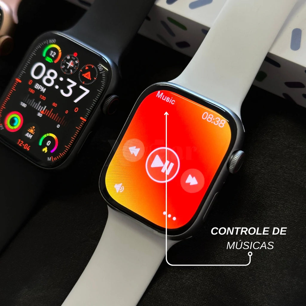 Tem coroa giratória funcional para navegar menus, ajustar brilho ou volume com precisão.