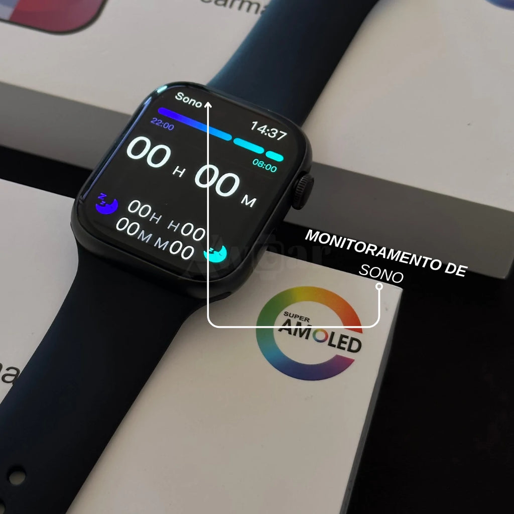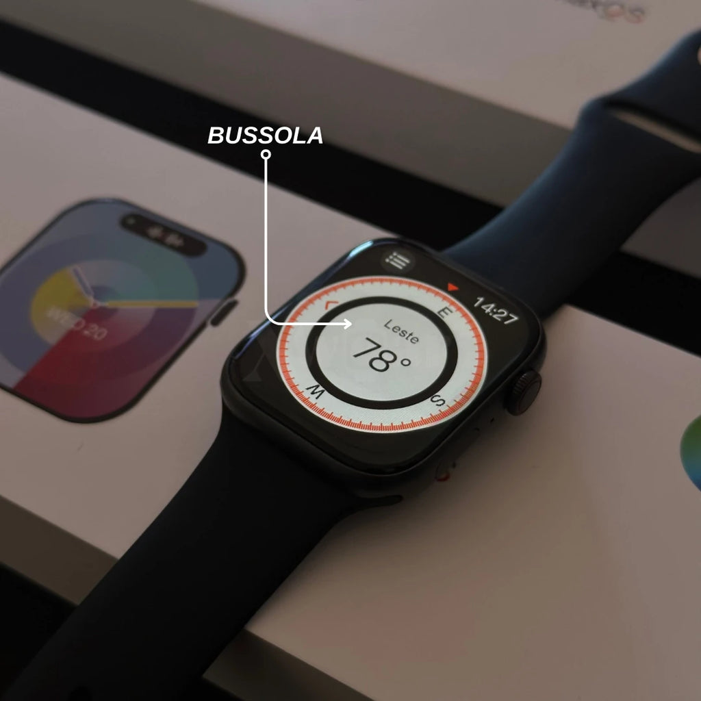 Monitor completo: frequência cardíaca, ECG, SpO₂, pressão, sono, ciclo menstrual, estresse, bússola, GPS pareado (dinâmico) e mais de 100 modos esportivos.