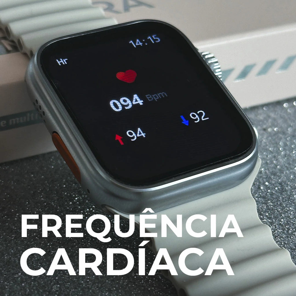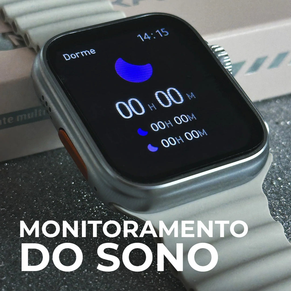 Monitor completo com frequency, ECG, SpO₂, pressão arterial, temperatura e acompanhamento do sono.