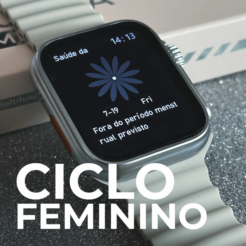 Oferece funções práticas como alarme, cronômetro, calculadora, jogos e ciclo menstrual.
